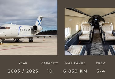 The Challenger 604 is a reliable and balanced business class aircraft that combines comfort, safety and efficiency. Its spacious and comfortable cabin allows you to travel comfortably even on longer flights, and its excellent performance ensures flexibility and safety for both medium and long-haul flights. An ideal choice for business trips, group travel or quick transfers - when time, comfort and reliability are important.