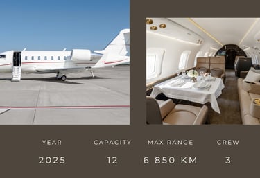 The Challenger 650 is a reliable and comfortable business class aircraft that combines efficiency and elegance. Its spacious, well-lit cabin with modern equipment provides comfort, and its efficient flight system allows you to reach major European and international cities without compromise. It is ideal for medium and long-haul trips - for business, family or VIP groups.