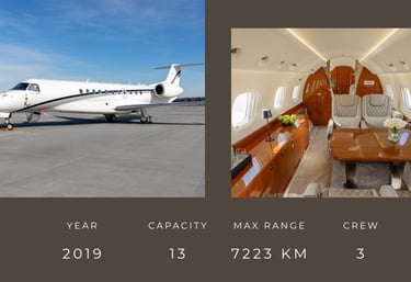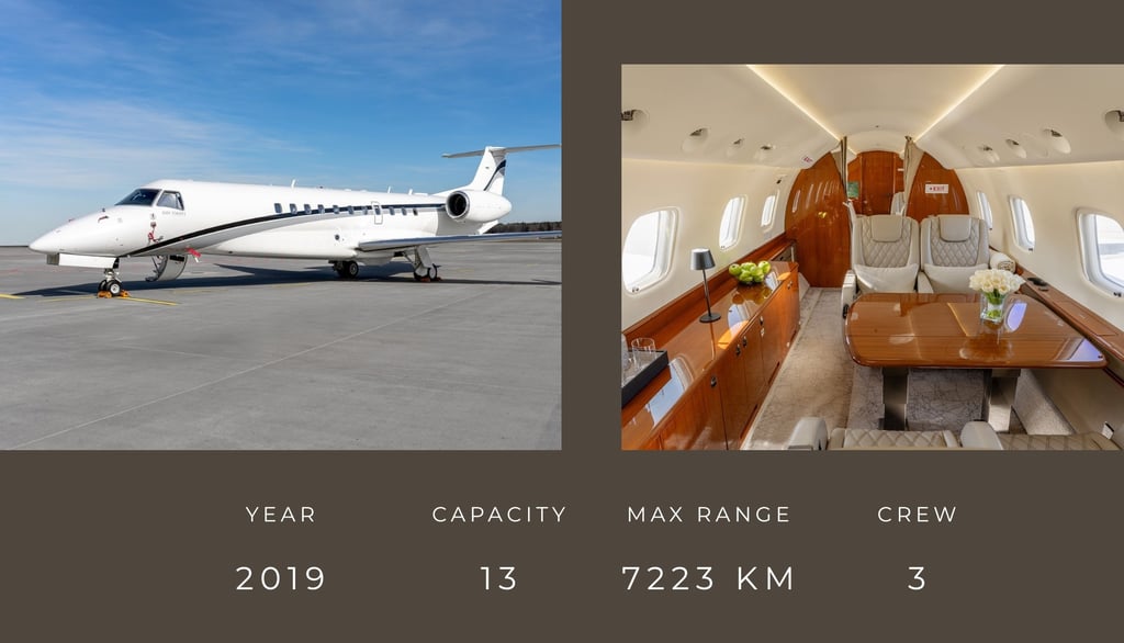 The Legacy 650 is a spacious and reliable business class aircraft that offers comfort and flexibility for both medium and long-haul travel. Its cabin is large enough for groups or families, and its functional interior and stable flight comfort make you feel safe and comfortable. The Legacy 650 is a versatile alternative - when you want to neatly combine the level of comfort, price and flight flexibility.